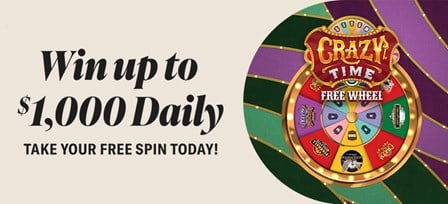 Take a spin on the Crazy Time Free Wheel for your chance to win up to a $1,000 Casino Bonus every day!